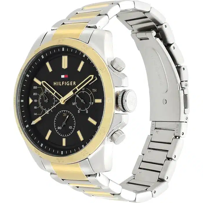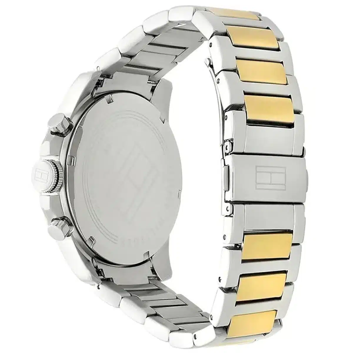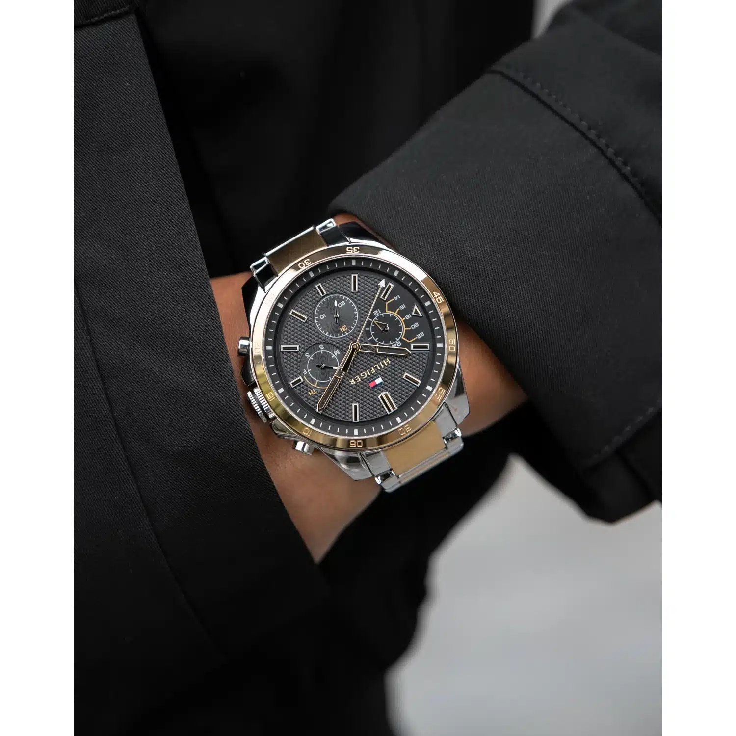ساعة تومي هيلفيغر للرجال أصلية موديل (ديكر) بلون أسود واستيك معدن فضي